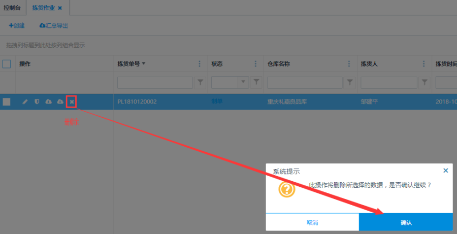 点击制单状态的拣货单,可点击操作栏中的<删除>按钮,可对拣货单进行删除操作。