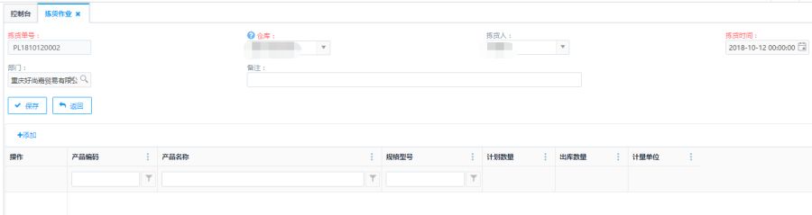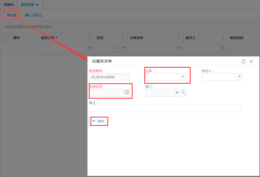 点击列表上方<创建>按钮,进入拣货单创建页面:选择【仓库】、【拣货人】、【拣货时间】、【部门】后点击<保存>,完成拣货作业的创建。
