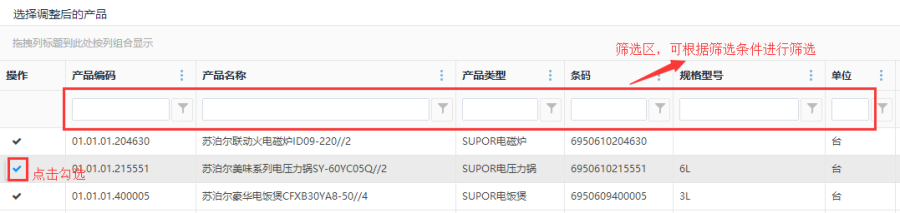 第四步:选择产品后,然后点击产品行操作栏中的<选择调整的商品>按钮,进入选择调整后的产品界面。