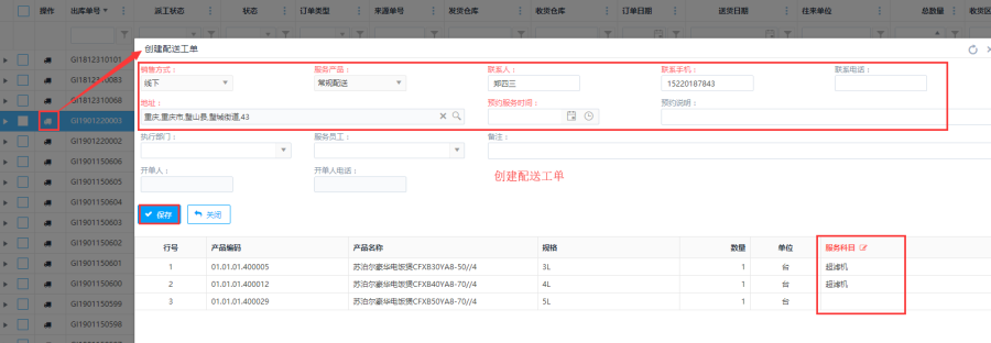 第二步:编辑创建配送工单页面内容,点击<保存>按钮,完成配送工单的创建,并自动生成一条订单到【配送工单】列表里。