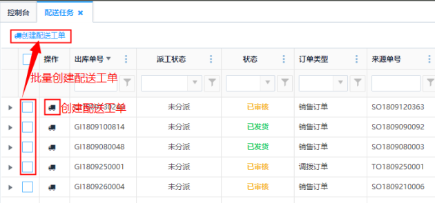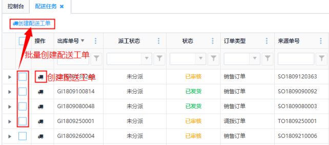第一步:勾选列表操作栏左方的多选框,然后点击列表上方的<创建配送工单>,弹出批量创建配送工单页面。