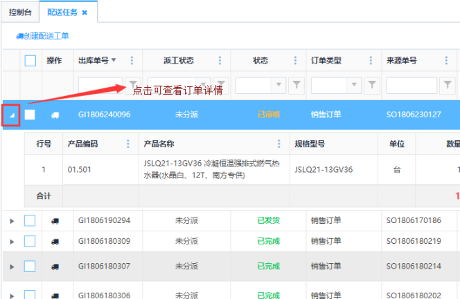 点击列表操作栏左方的三角形按钮,可以查看订单的产品明细