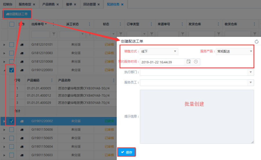 第二步:编辑创建配送工单页面内容,点击<保存>按钮,完成配送工单的批量创建,并自动生成订单到【配送工单】列表里。