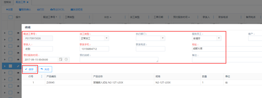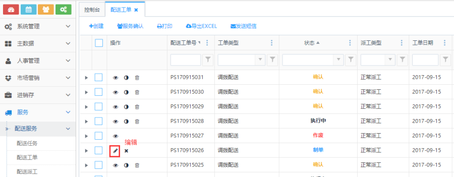 "制单"状态的订单,点击操作栏的<编辑>按钮,便会跳转到配送工单详情页面,编辑完后点击保存即可。