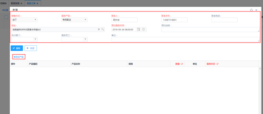 第二步:编辑配送工单内容,点击<添加产品>按钮