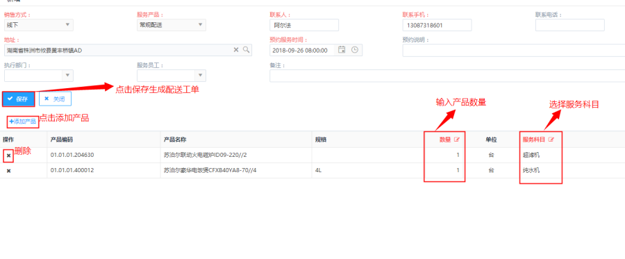 第三步:选择产品之后确认是否产品选择正确,若发现产品有误则点击<删除>进行删除,若需要继续添加产品则点击<添加>进行添加,若产品选择完毕,则填写数量,选择服务科目后点击<保存>完成配送工单的创建。