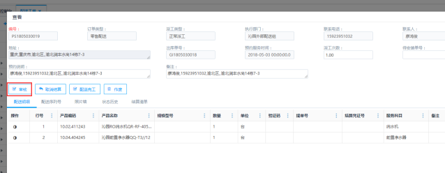对于【配送完成】的单据可进行财务审核操作,点击<查看>按钮,进入工单查看页面,点击<审核>按钮可完成财务费用审核操作,工单状态变为"财务审核"。