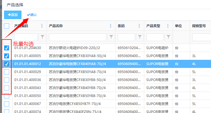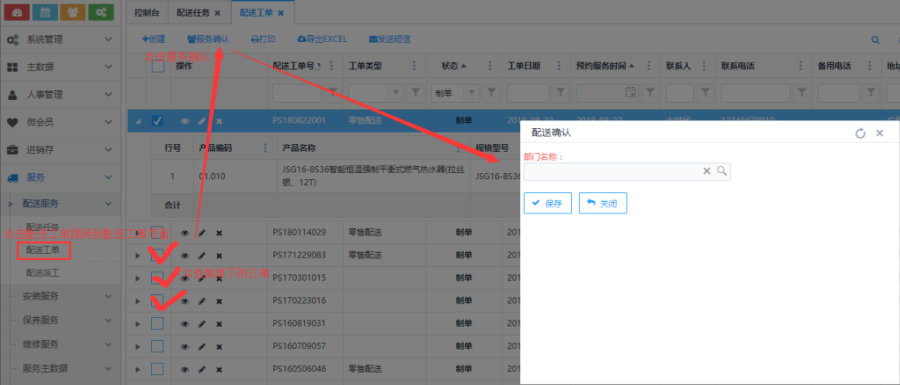 "制单"状态的订单,可点击左侧多选框选中配送工单,再点击列表上方<服务确认>,可弹出配送确认页面,选择部门,点击<保存>按钮,订单就会变为"已确认"状态。