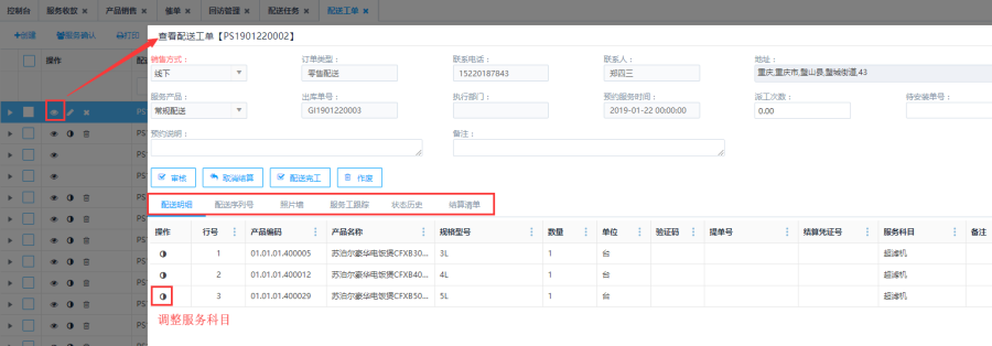 所有状态的订单,点击<查看>按钮,查看界面包括:配送明细、配送序列号、照片墙、服务工跟踪、状态历史、结算清单等信息;点击不同的tab页名称,展示不同的tab项。