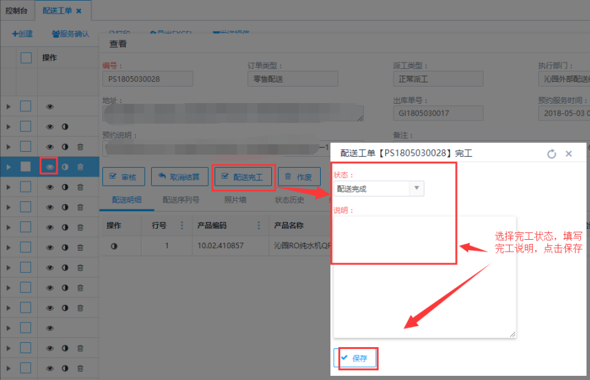 对于"已派工"、"执行中"、"暂挂"等单据,可以手动完成工单,进入查看页面,点击<配送完工>按钮,弹出操作框,可选择完工状态,填写完工说明,点击保存即可完成操作。