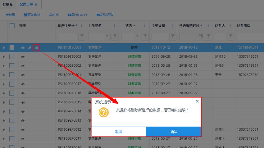 制单状态的订单,可以对工单进行删除操作。点击<删除>,弹出提示,点击提示上的<确认>按钮,删除该条记录;点击提示上的<取消>按钮,则返回不删除。