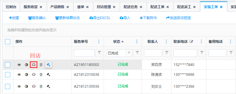 勾选需要发送回访短信的订单点击<发送回访短信>按钮