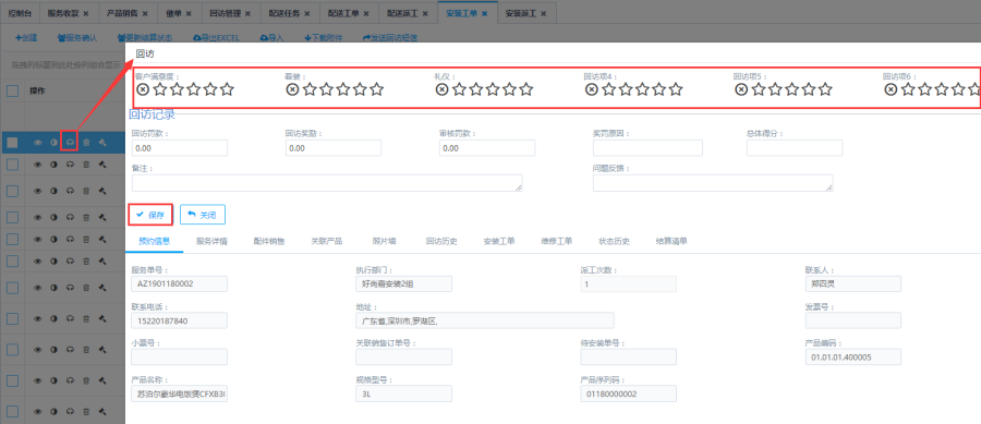 在操作栏点击<回访>按钮,便会弹出回访页面,填写回访记录,点击<保存>即可,会自动生成一条回访记录到【回访管理】列表里。
