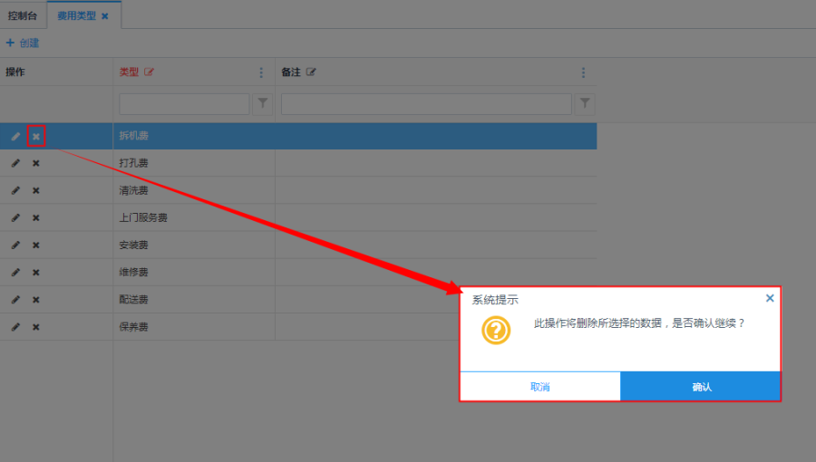 点击<删除>按钮,弹出提示,点击提示上的<确认>按钮,删除该条记录;点击提示上的<取消>按钮,则返回不删除。