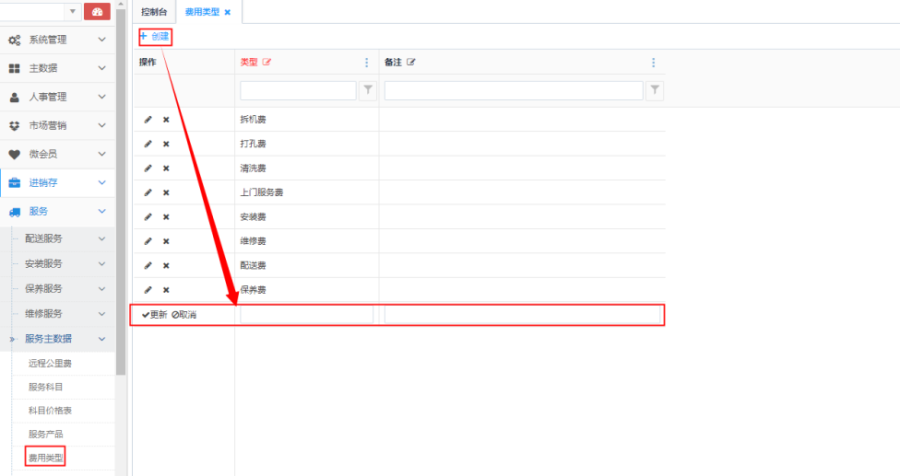 点击左上角<创建>按钮,在编辑栏填写好相关信息后点击<更新>按钮,完成费用类型的创建。