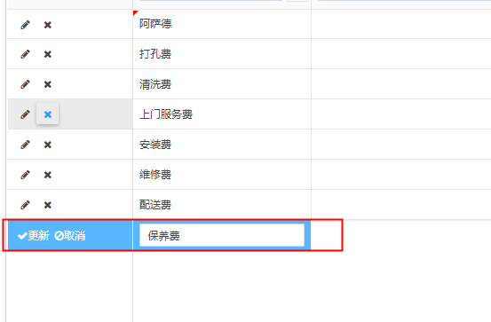 当费用类型发现有误,则可以在操作栏点击<编辑>按钮,显示费用类型编辑栏,编辑完后点击<更新>按钮,更新成功;点击<取消>按钮,关闭编辑栏。