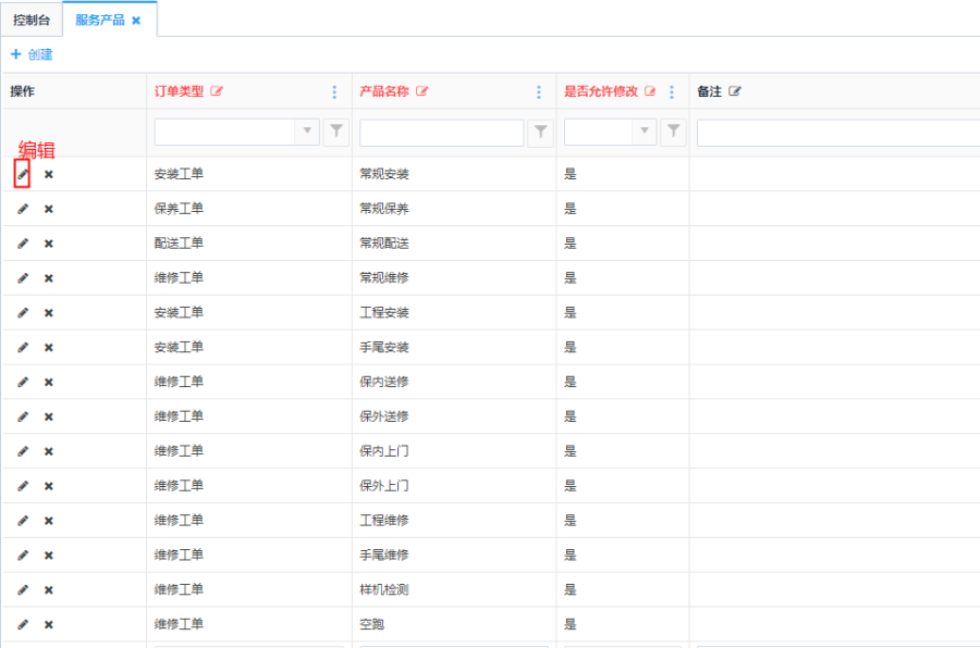 当服务产品发现有误,则可以在操作栏点击<编辑>按钮,显示服务产品编辑栏,编辑完后点击<更新>按钮,更新成功;点击<取消>按钮,关闭编辑栏。