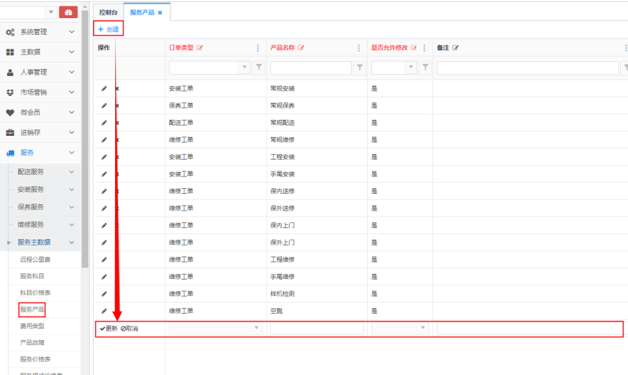 点击界面的<创建>按钮,填写产品名称、订单类型、选择是否允许被修改,然后点击<更新>即可。