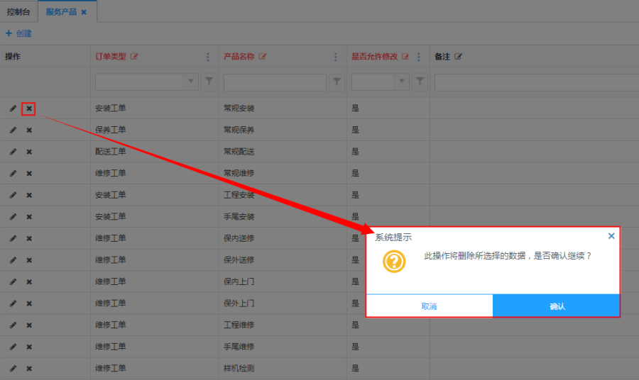 点击<删除>按钮,弹出提示,点击提示上的<确认>按钮,删除该条记录;点击提示上的<取消>按钮,则返回不删除。