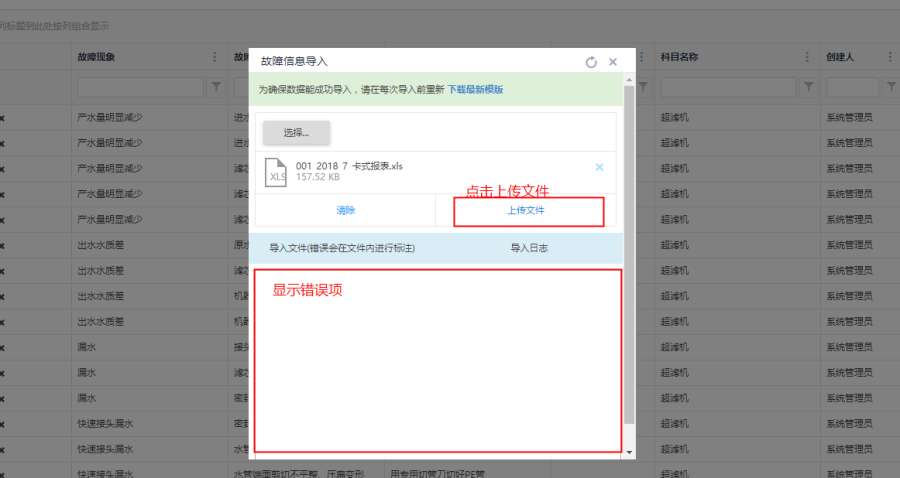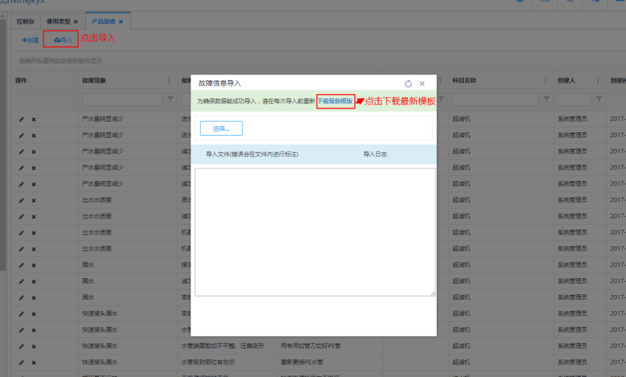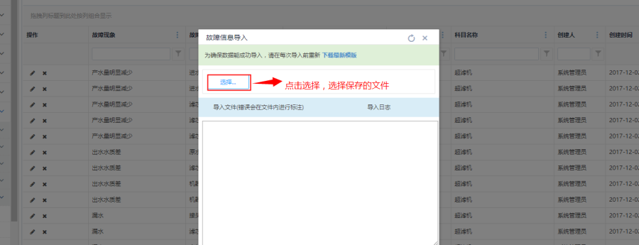 第二步:下载模板后,填写相应的数据,点击<选择>,选择保存的文件: