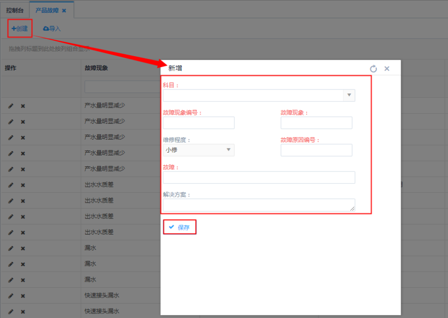 点击<新建>按钮,弹出新增界面,输入故障信息后,点击<保存>按钮,完成产品故障的创建。