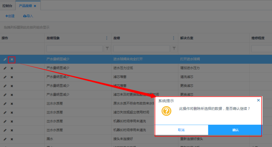点击<删除>按钮,弹出提示,点击提示上的<确认>按钮,删除该条记录;点击提示上的<取消>按钮,则返回不删除。