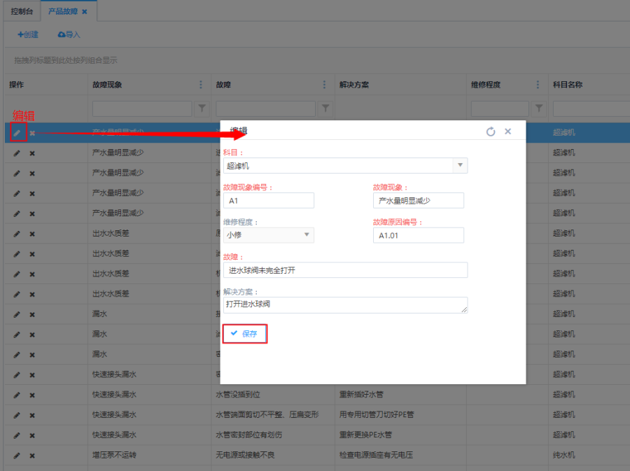 当信息有误,则可以在操作栏点击<编辑>按钮,跳转到产品故障编辑页面,编辑完后点击<保存>即可。