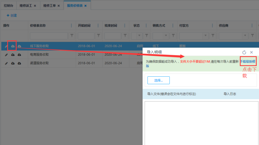 第一步:点击列表上方的<导入>按钮,在保养单导入页面点击<下载最新模板>填写好内容: