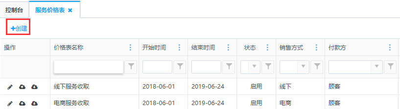第一步:点击列表左上方<创建>按钮,进入服务价格表的创建页面: