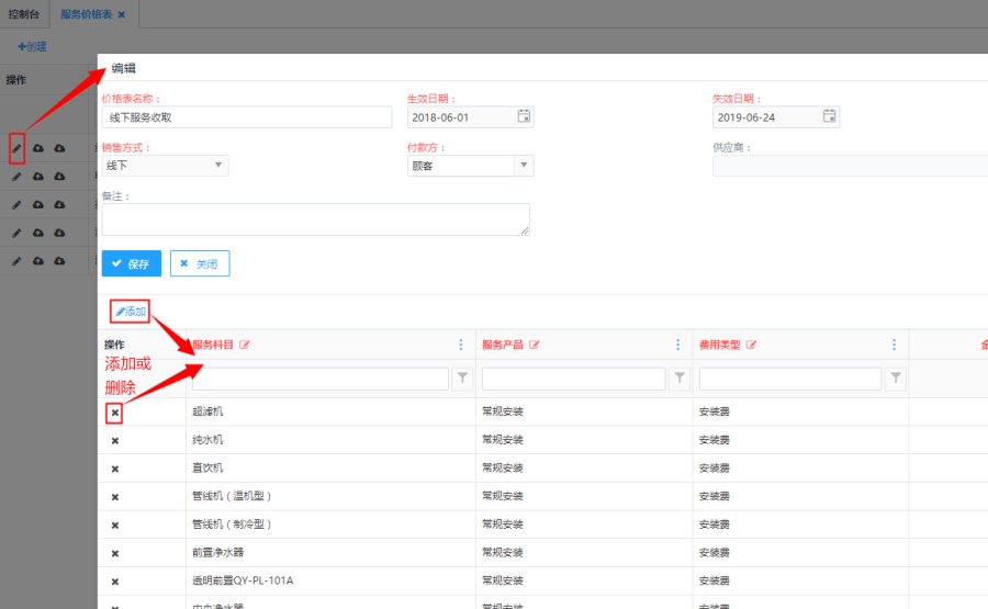 点击<编辑>按钮,可修改价格表内容及删除或增加服务科目。然后点击<保存>按钮,编辑成功。