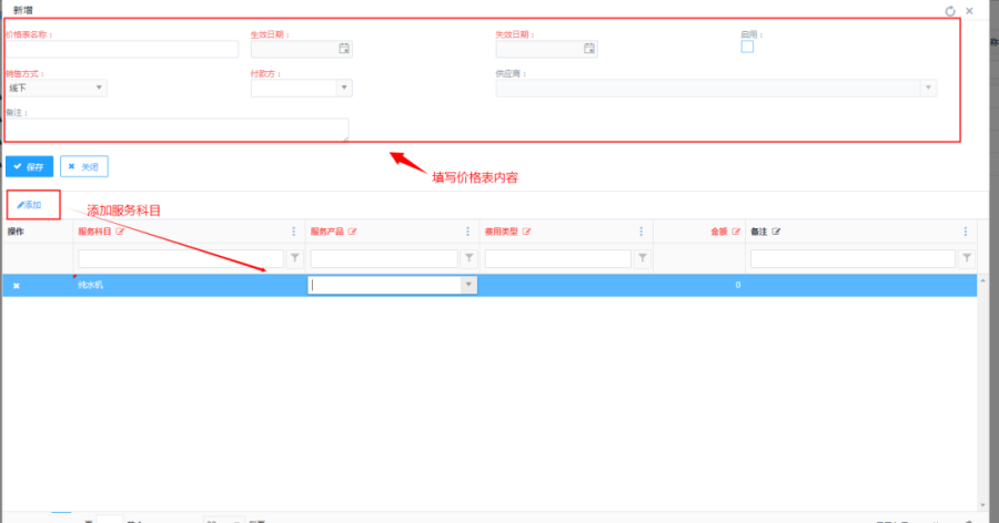 第二步:服务价格表创建页面,编辑价格表内容,点击<添加>按钮添加服务科目、服务产品、费用类型,输入金额: