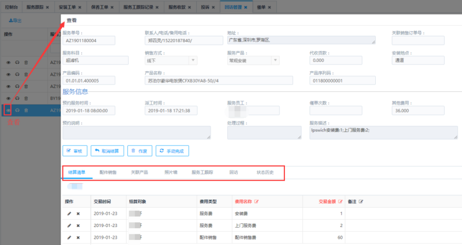 点击<查看>按钮,查看界面包括:订单信息、服务信息、结算清单、配件销售、关联产品、照片墙、服务工跟踪、回访、状态历史等信息;