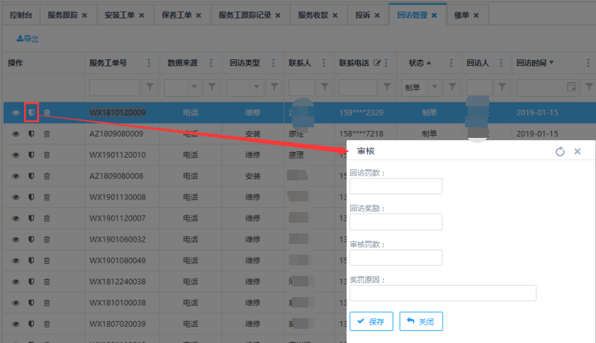 可点击列表操作栏的<审核>按钮对回访单据进行审核;在查看界面进行审核操作。审核成功的回访单由【制单】状态变为【已审核】状态。