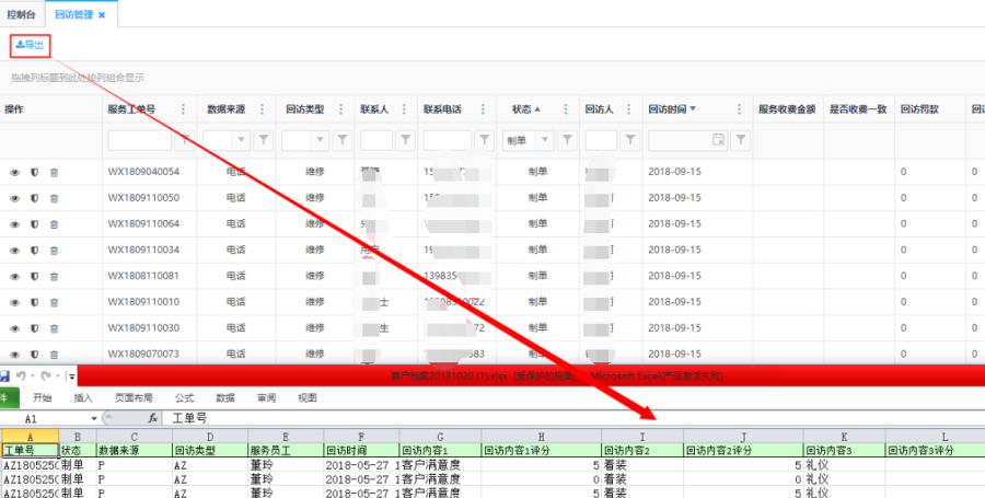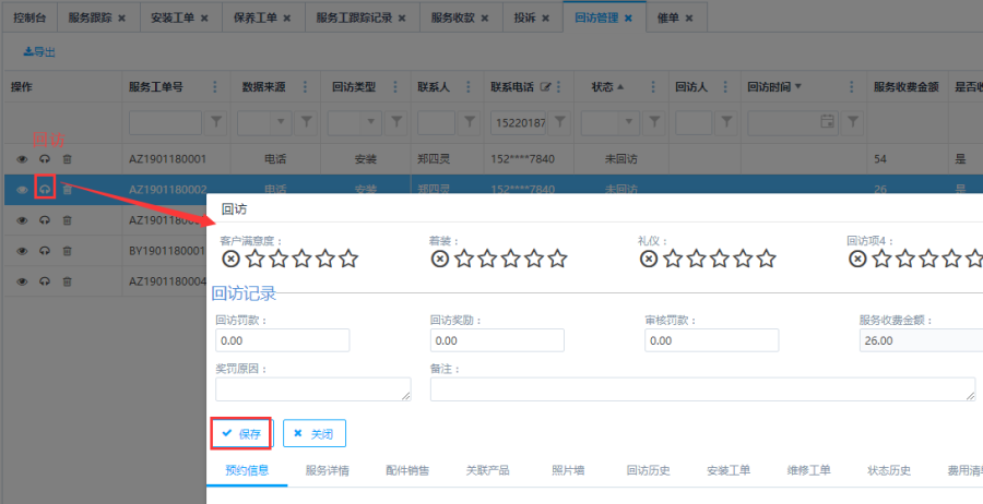 状态为"未回访"的订单,点击列表操作栏的<回访>按钮,弹出回访界面,添加回访信息后点击<保存>按钮,状态变为"制单",并且显示回访人和回访时间。