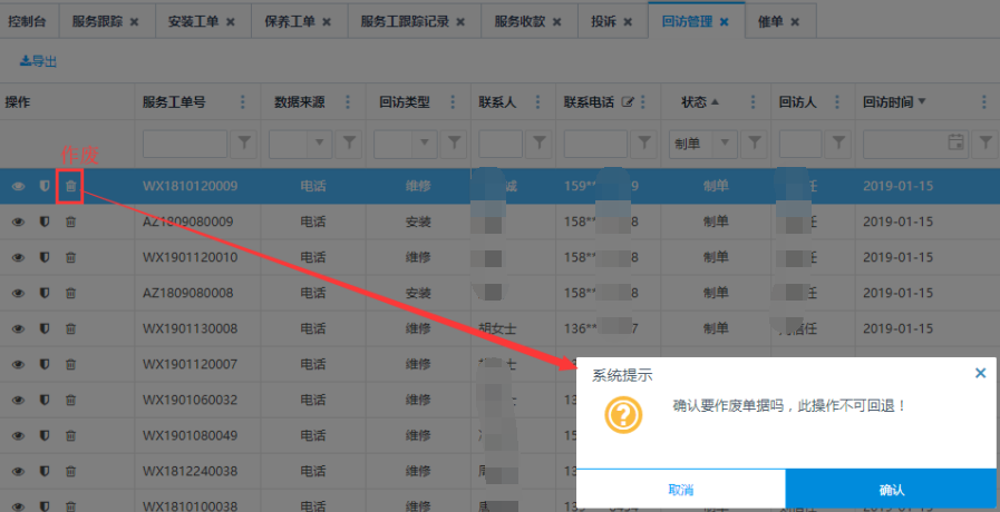 点击列表操作栏的<作废>按钮作废所选回访单据;在查看界面进行作废操作。