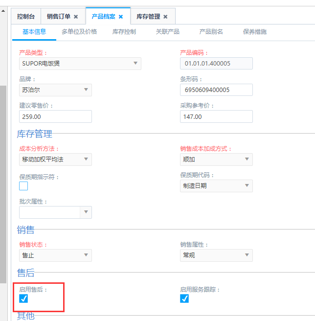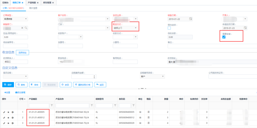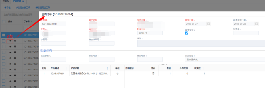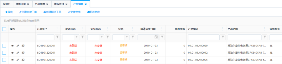 - 生成产品销售的条件:1.需要在产品档案中维护产品是否有启用售后;2.创建销售订单时是否有选择送货上门和勾选是否安装;3.销售订单审核后会自动生成产品销售单。(如图10-9-1-1和图10-9-1-2所示)