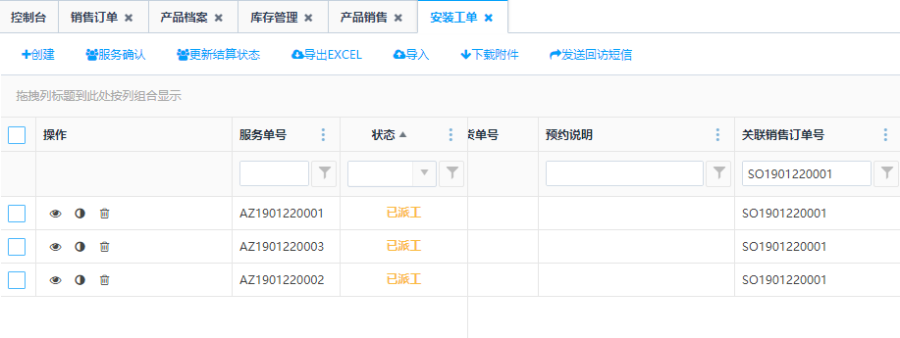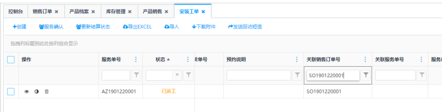 - 批量创建安装工单时首先需要在产品档案中维护该产品的服务科目。