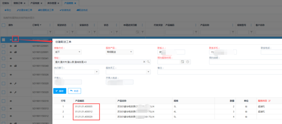 配送状态为"未配送"时,点击列表操作栏的<生成配送单>按钮,弹出创建配送工单界面,输入其他信息后点击【保存后关闭】按钮,可将产品销售单直接生成一条配送工单到【配送工单】列表里。配送状态变为"全部配送"。