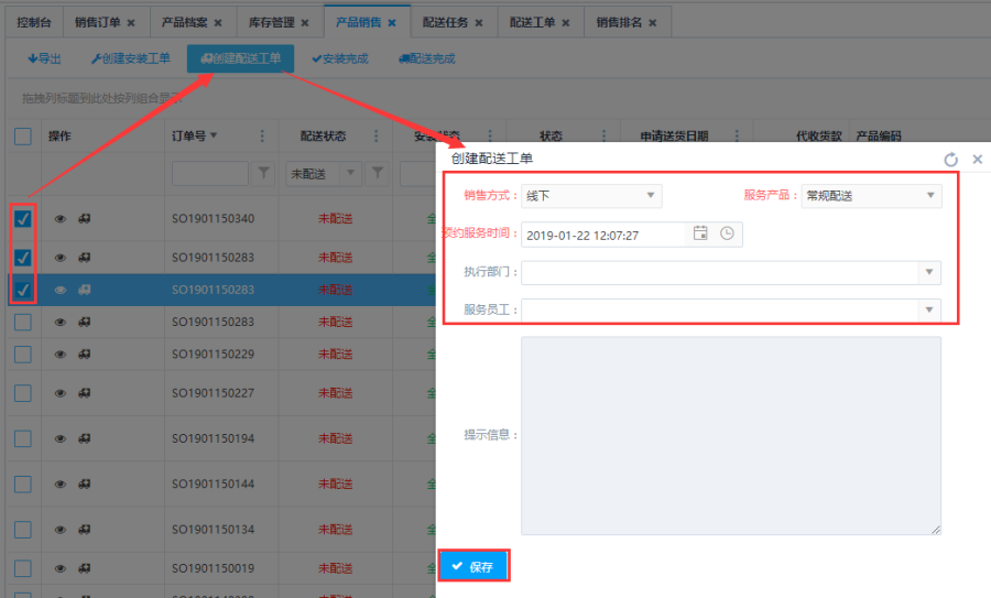 - 勾选批量创建配送工单时,同一条订单号的产品销售单生成一条配送工单;不同订单号的产品销售单生成多条配送工单。