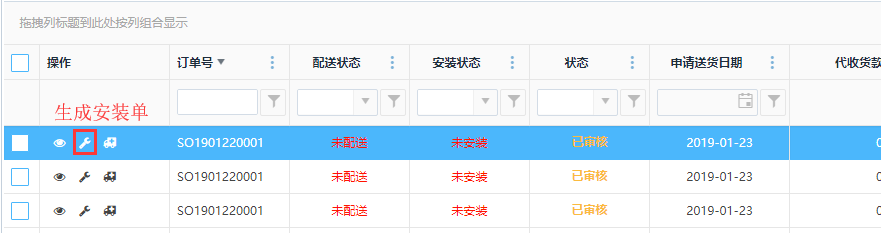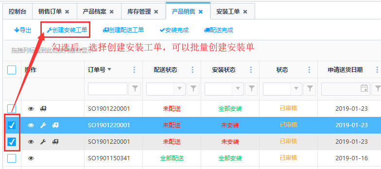 安装状态为"未安装"时,勾选列表操作栏左方的多选框,然后点击列表上方的<创建安装工单>可批量生成安装单到【安装工单】列表里。