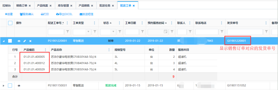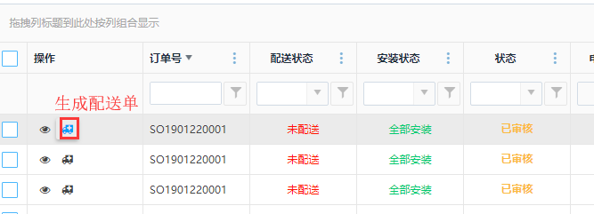 - 同一个订单号的的产品销售单点击生成配送单时只会生成一条配送工单。成功后在配送工单查看的发货单号是该销售订单的发货单号。