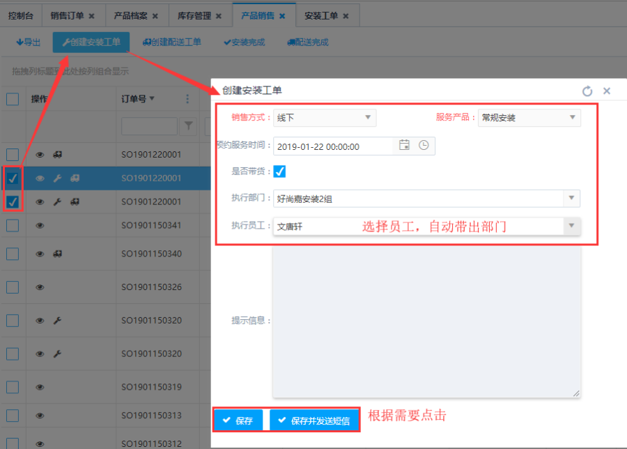 - 选择服务员工后,创建完成的订单状态为"已派工",并生成一条订单到【安装派工】列表里;