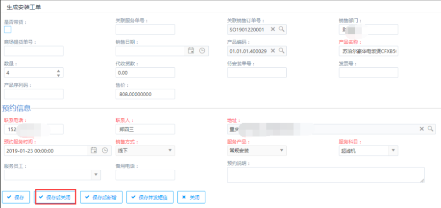 安装状态为"未安装"时,点击操作栏的<生成安装单>按钮,弹出创建安装工单界面,输入其他信息后点击【保存后关闭】按钮,可将产品销售单直接生成一条安装工单到【安装工单】列表里。安装状态变为"全部安装"。
