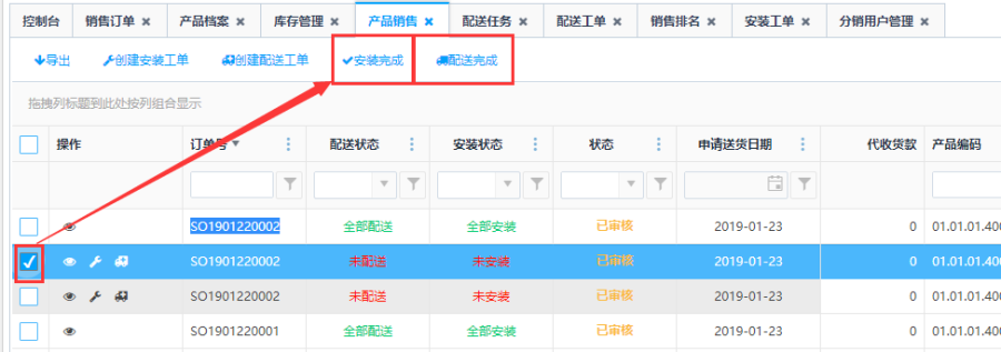 配送状态为"未配送"和安装状态为"未安装"时,勾选左边多选框,点击列表上方的<安装完成>和<配送完成>按钮,状态转变为"全部配送"和"全部安装",不生成配送工单和安装工单。