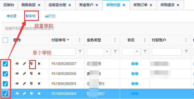 状态为"制单"的订单,可在采购付款首页操作栏点击<审核>,或点击左侧多选框选中多个采购付款单后,再点击列表上方<审核>按钮批量完成审核,采购付款单审核后,状态转为"已审核"。