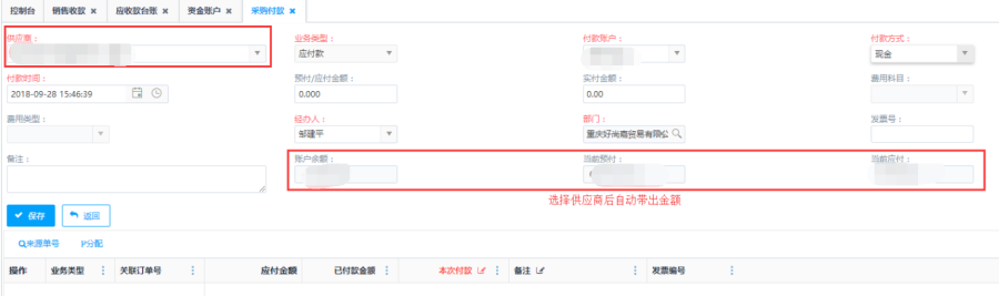 第二步:编辑采购付款订单内容,选择供应商、业务类型、付款账户、付款方式、付款时间、经办人、部门,然后点击<来源单号>按钮选择供应商关联的采购单: