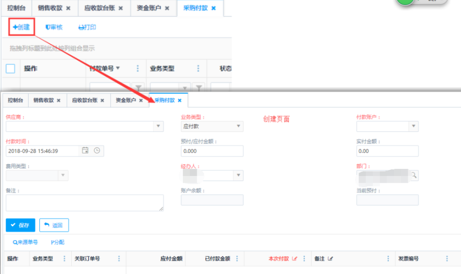 第一步:点击列表左上方<创建>按钮,进入采购付款单的创建页面: