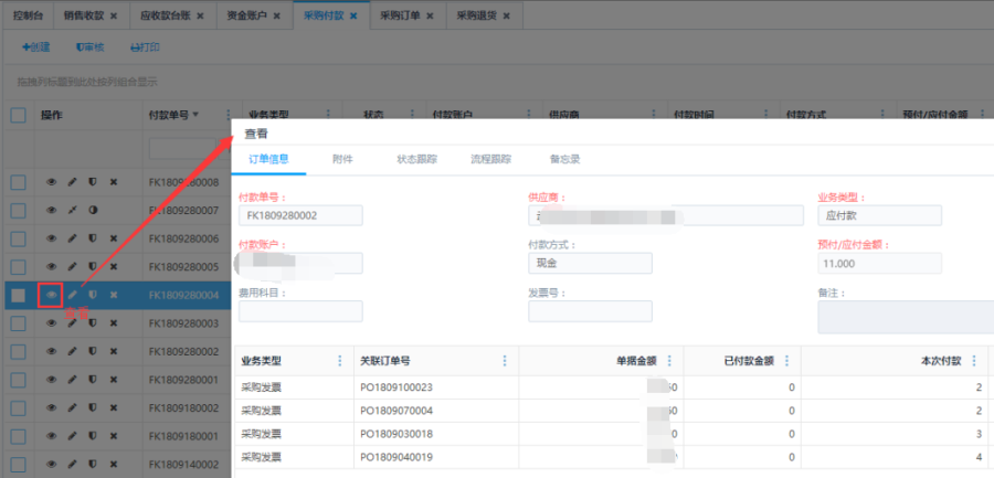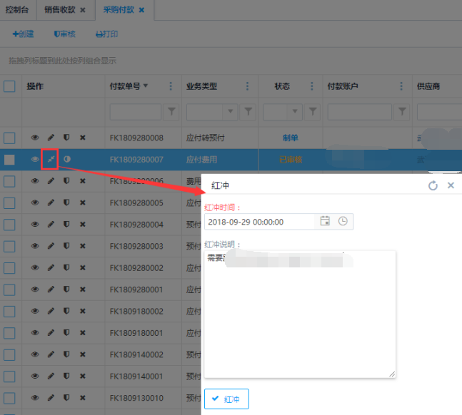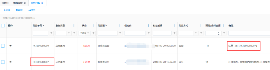"已审核"状态的采购付款单,可以在操作栏点击<红冲>按钮,完成红冲操作,单据状态转为"已红冲",并且会生成另一个状态为"已红冲"的采购付款单,在备注中显示红单,来自哪个单号(如图所示)。