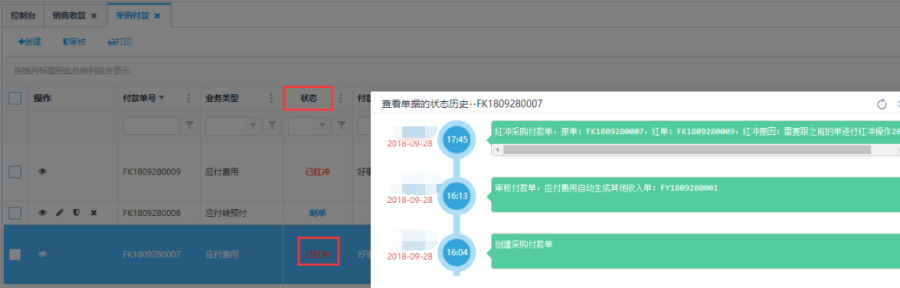 所以状态下的订单,点击<状态>查看,可以查看该单据状态的历史记录