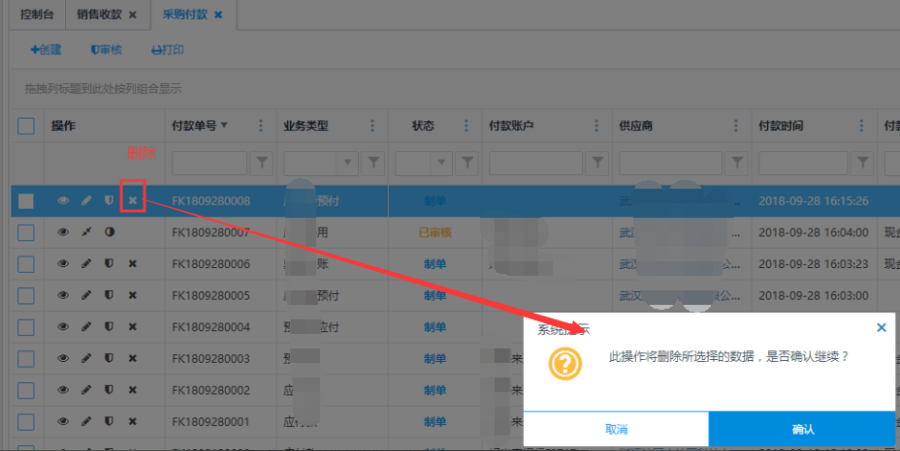 制单状态下的采购付款单,点击操作栏<删除>按钮可删除采购付款单。